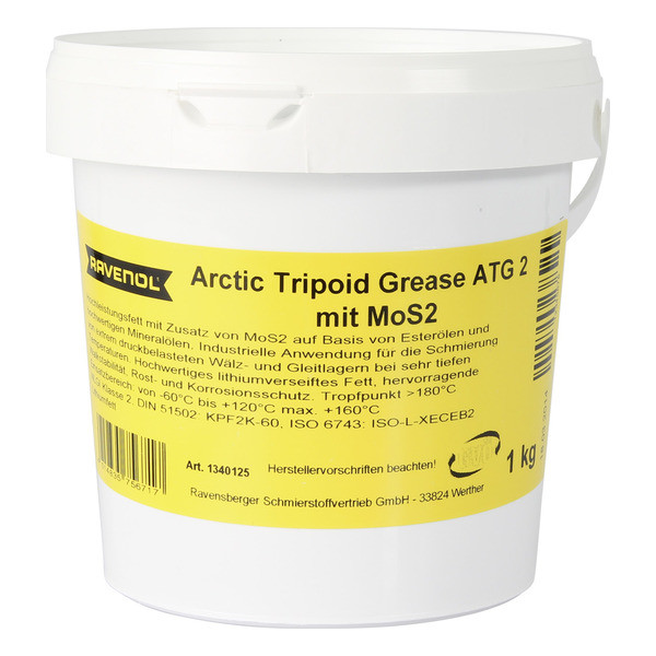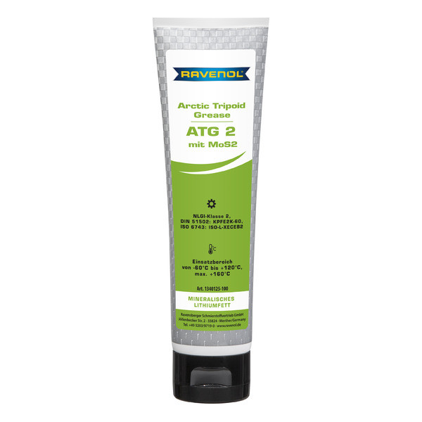 RAVENOL Arctic Tripoid Grease ATG 2 mit MoS2-ը լիովին սինթետիկ, հատուկ մշակված քսուք է, որը հիմնված է սինթետիկ բաղադրիչների (էսթերների), պոլիալֆաոլեֆինների վրա, հանքային յուղի և MoS2-մոլիբդենի դիսուլֆիդային հավելանյութի, խտացուցիչի՝ լիթիումի օճառի ավելացման վրա: