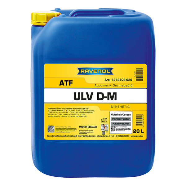 RAVENOL ATF ULV D-M Ավտոմատ փոխանցման հեղուկ (ATF) նախատեսված է Ford և GM վերջին 6, 8 և 10 արագությամբ ավտոմատ փոխանցման տուփերի համար: