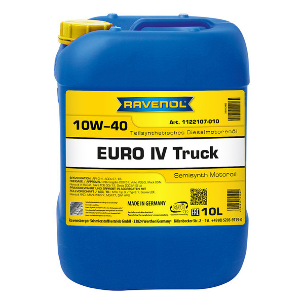 RAVENOL EURO IV Truck SAE 10W-40 - Ունիվերսալ կիսասինթետիկ շարժիչի յուղ, որը հիմնված է սինթետիկ բազային յուղի վրա, որը զուգորդվում է ամենաժամանակակից հավելումներով տուրբո լիցքավորված և առանց ծանրաքաշ մեքենաների, ավտոբուսների և հատուկ տեխնիկայի դիզելային շարժիչների, ինչպես նաև վերջին սերնդի 4-հարվածային դիզելային շարժիչների համար: