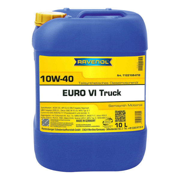 RAVENOL EURO VI Truck SAE 10W-40 բոլոր սեզոնային շարժիչային յուղ ' արտանետվող գազերի արտանետումների նկատմամբ բարձր պահանջներ ունեցող մեքենաների համար: