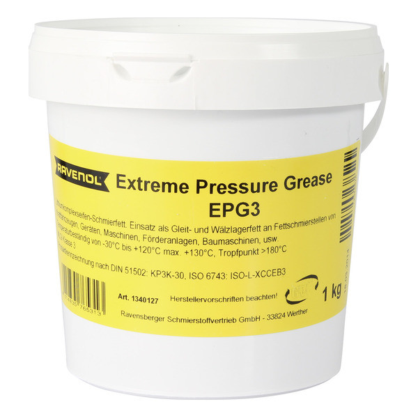 RAVENOL Extreme Pressure Grease EPG 3 is especially recommended as grease for friction bearings and roller bearings at lubricating points of motor vehicles, equipment, machinery, conveying systems, construction machines etc.