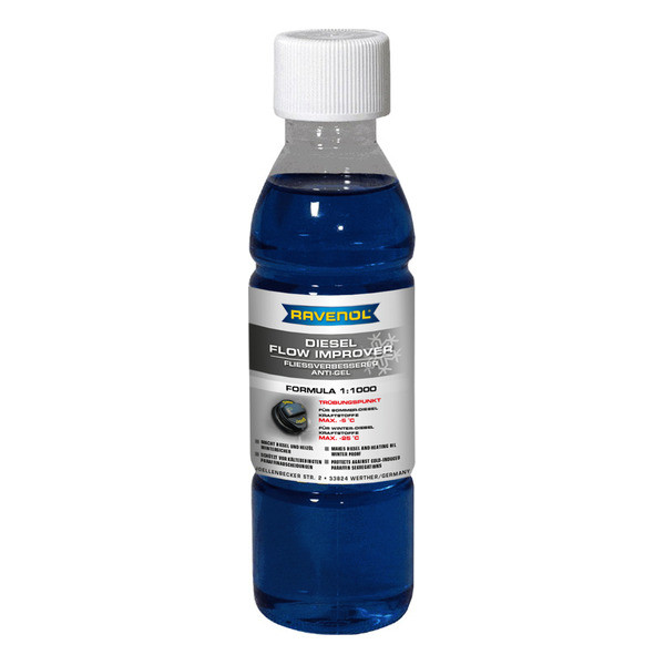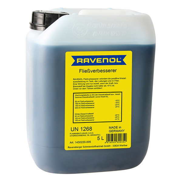 Դիզելային վառելիքի համալիր բազմաֆունկցիոնալ հավելանյութ RAVENOL Fliessverbesserer պատրաստված է Գերմանիայում ՝ օրգանական լուծիչում լուծված հալոգեններ և եթերային խմբեր պարունակող օլեֆինների հիման վրա ։