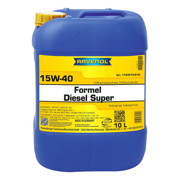 RAVENOL Formel Diesel Super 15W-40 - բարձրորակ հանքային շարժիչի յուղ տուրբո լիցքավորմամբ և առանց դիզելային շարժիչների մարդատար և բեռնատար ավտոմեքենաների համար: Ապահովում է ամուր յուղային թաղանթ և կտրելու կայունություն, գերազանց մաքրող հատկություններ և բարձր դիմադրություն ծերացմանը: