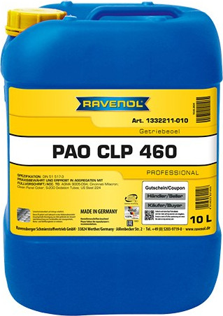RAVENOL Getriebeoel CLP PAO 460-ը լիովին սինթետիկ փոխանցման տուփի յուղ է, որը արտադրվում է Գերմանիայում՝ ամենաբարձր որակի պոլիալֆաոլեֆինային բազային յուղի հիման վրա։