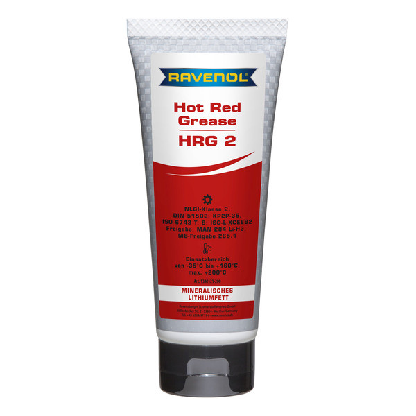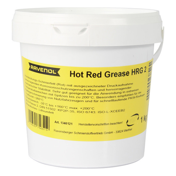 RAVENOL Hot Red Grease HRG2 - ավտոմոբիլային քսանյութը կարմիր է, արտադրվում է հանքային բազային յուղի հիման վրա, խտացված լիթիումի օճառով լոգարիթմական առանցքակալների, մեքենաների շարժակազմի, մեխանիզմների, սարքերի, Փոխակրիչների, շինարարական մեքենաների և այլնի համար, որոնք գործում են բարձր ջերմաստիճանում: Արտահոսքի կայունություն, կոռոզիայից և ժանգից պաշտպանություն: