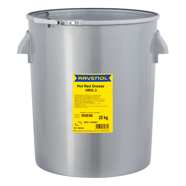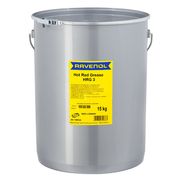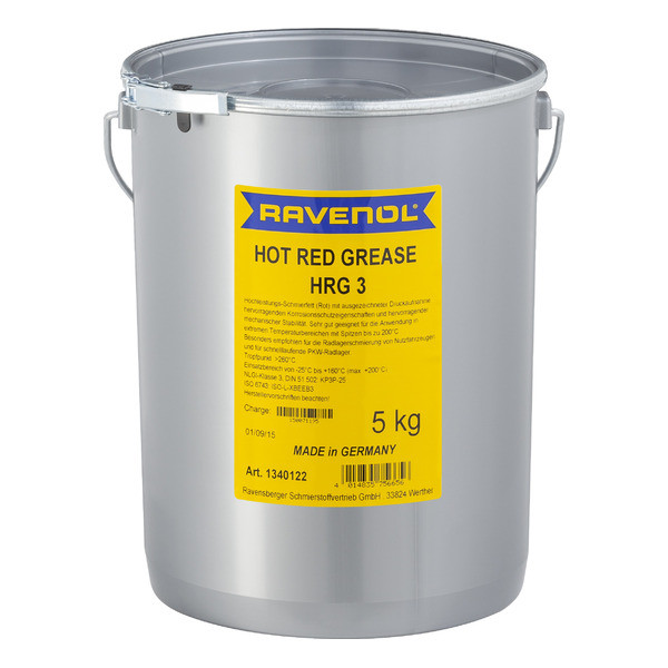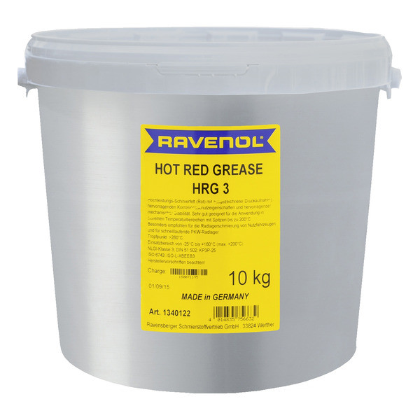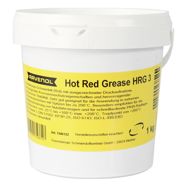 RAVENOL Hot Red Grease HRG 3 is a red lithium complex soap lubricating grease on the basis of high quality base oils. Excellent work resistance, rust and corrosion protection. Application for the lubrication of roller and friction bearings under extreme pressure at high bearing temperatures. Particularly recommended for the lubrication of wheel bearings on commercial vehicles and for high-speed passenger car wheel bearings.