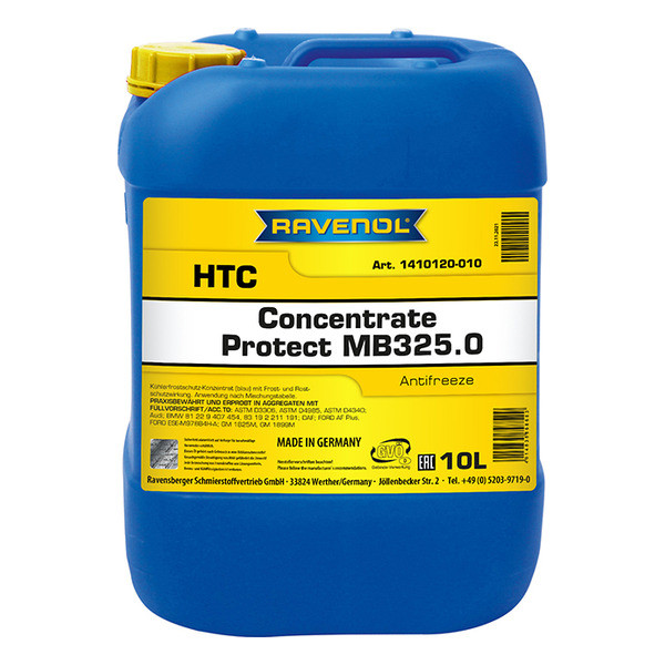 RAVENOL HTC Protect MB 325.0 Concentrate – խտացված անտիֆրիզ՝ հիմնված 1.2-Ethandiol (մոնոէթիլեն գլիկոլ) և կոռոզիոն արգելակիչների վրա՝ օգտագործելով օրգանական OAT տեխնոլոգիա Mercedes, BMW, Opel, Saab, GM մեքենաների շարժիչների հովացման համակարգերի համար: Չի պարունակում ամիններ և ֆոսֆատներ։ Ապահովում է ալյումինե շարժիչի երկարատև (մինչև 3 տարի) հակակոռոզիոն պաշտպանություն ինչպես ձմռանը, այնպես էլ ամռանը: Շրջակա միջավայրի համար վտանգավոր չէ.