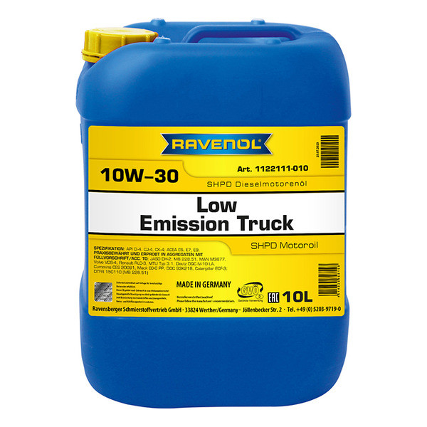 RAVENOL Low Emission Truck SAE 10W-30 բոլոր սեզոնային SHPD շարժիչային յուղ է (Super High Performance Diesel), որը մշակվել է արտանետումների արտանետումների Euro V և Euro VI ստանդարտներով և օգտագործվում է չափազանց ծանր բեռնվածությամբ կոմերցիոն մեքենաների դիզելային շարժիչներում: