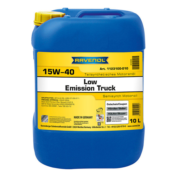 RAVENOL Low Emission Truck SAE 15W-40 – կիսասինթետիկ Շարժիչային յուղ API CJ-4 դասի բեռնատարների համար՝ ցածր մոխրի հավելումների փաթեթով Ցածր SAPS (սուլֆատացված մոխրի, ֆոսֆորի, ծծմբի ցածր պարունակություն) մեքենաներում օգտագործելու համար 2007 թվականից: