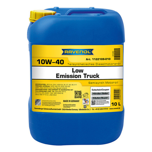 RAVENOL Low Emission Truck SAE 10W-40 – սա ամբողջ տարվա բարձր արդյունավետությամբ շարժիչային յուղ է, որը հատուկ նախագծված է Euro V և Euro VI շարժիչներում տնտեսական օգտագործման համար ' SAE 10W-40 մածուցիկության դասի ծանր տրանսպորտային միջոցների դիզելային շարժիչներում հետմաքրման համակարգերով: Դիմում: բեռնատար, գյուղատնտեսական մեքենաներ.
