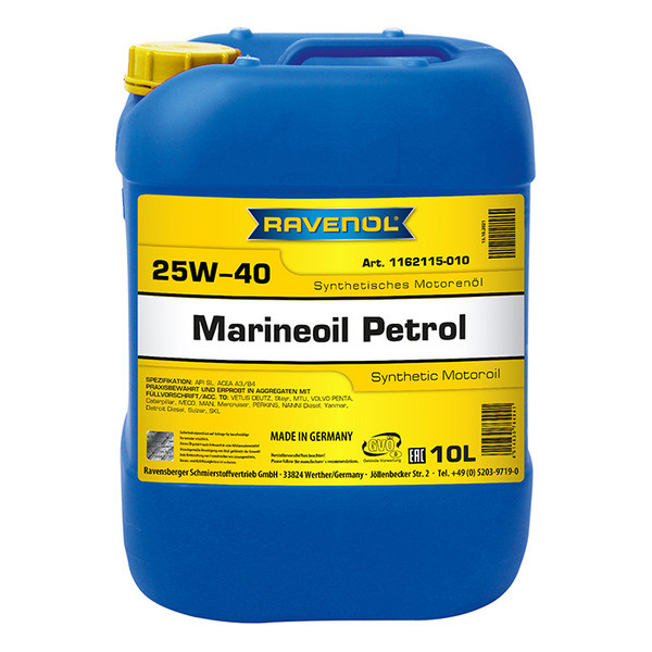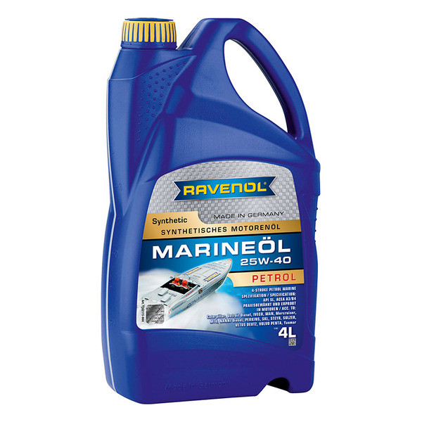 RAVENOL MARINEOIL PETROL 25W-40 Synthetic – սինթետիկ հիմքով շարժիչային յուղ, որը հատուկ նախագծված է 4 հարվածներով ներարկվող արտաքին նավակի շարժիչների համար: Այն ապահովում է անթերի քսում նույնիսկ բարձր արագությամբ և բեռներով, պաշտպանություն մաշվածությունից ' ցածր մակարդակի հավելանյութերի փաթեթի շնորհիվ, պաշտպանություն կոռոզիայից: Ներկված է կապույտ գույնով: