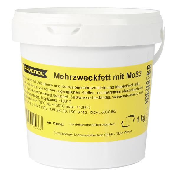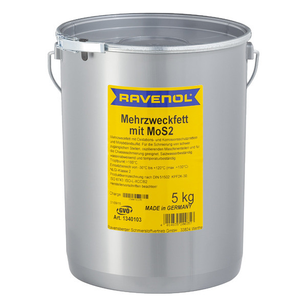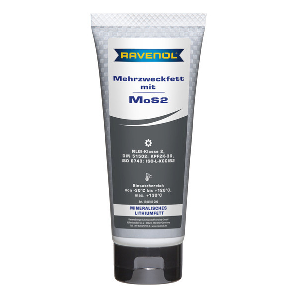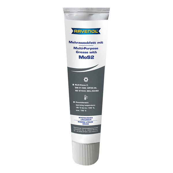 RAVENOL Mehrzweckfett mit MoS2-ը հանքային հիմքով ավտոմոբիլային քսուք է, որը խտացված է լիթիումի օճառով՝ հակաօքսիդանտային և հակակոռոզիոն հավելանյութերի, ինչպես նաև մոլիբդենի դիսուլֆիդի (MoS2) ավելացմամբ։