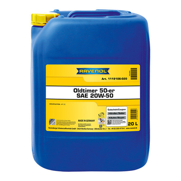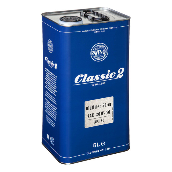 RAVENOL Oldtimer 50-er SAE 20W-50 API SC սա տարբեր ապրանքանիշերի լեգիրված շարժիչային յուղ է, որը նախատեսված է Մինչև 1967 թվականը արտադրված դասական մեքենաներում օգտագործելու համար: Դրա արտադրության մեջ օգտագործվում են խնամքով ընտրված մաքուր հանքային ռաֆինատներ և հավելանյութեր։ Այն դիմացկուն է օքսիդացմանը, չի փրփրում, ինչպես նաև ունի գերազանց մածուցիկության և ջերմաստիճանի բնութագրեր ։ Իր ցածր տեղադրման ջերմաստիճանի շնորհիվ այս յուղը կարող է օգտագործվել ինչպես ցածր, այնպես էլ բարձր ջերմաստիճաններում և երաշխավորում է կատարյալ քսում: Այն հարմար է Մինչև 1967 թվականը արտադրված բենզինային և դիզելային շարժիչների / դասական մեքենաների մեծ մասի համար: Այս յուղի օգտագործումը ժամանակակից շարժիչներում կարող է հանգեցնել դրանց աշխատանքի վատթարացման կամ կոտրման: