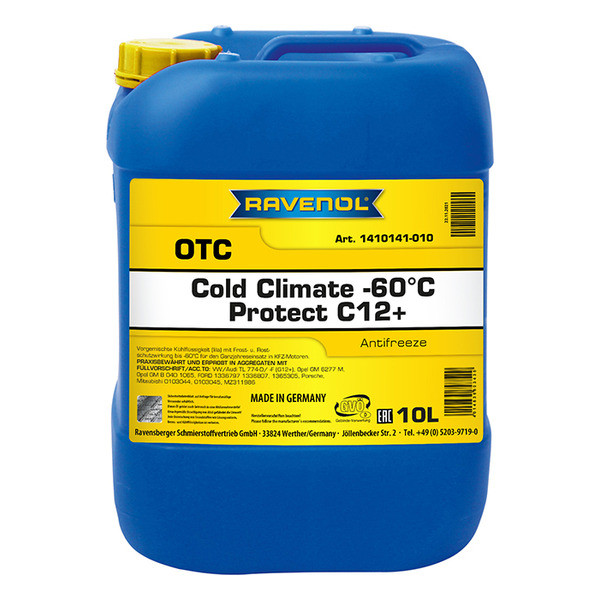 RAVENOL OTC COLD CLIMATE -60°C -օգտագործման համար պատրաստի հովացուցիչ նյութ, նախապես ջրի հետ խառնված, առանց սիլիկատների, բորատների, նիտրիտների և ֆոսֆատների պարունակության, որը մշակվել է 1.2 - Ethandiol (մոնոէթիլ գլիկոլ) հիման վրա հովացման համակարգերի համար, որը երաշխավորում է պաշտպանություն կոռոզիայից և սառեցումից, արտոնագրված OAT տեխնոլոգիայի կիրառմամբ և կոռոզիայի ինհիբիտորների ավելացմամբ, ինչը երկարացնում է օգտագործման ժամկետը և պաշտպանությունը ծայրահեղ ցածր ջերմաստիճաններում, երբ կիրառվում է ցածր ջերմաստիճաններով կլիմայական գոտիներում: