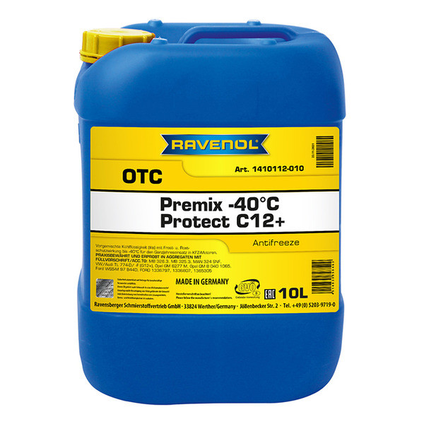 RAVENOL OTC Protect C12+ Premix -40°C – 1.2-Էթանդիոլի (մոնոէթիլեն գլիկոլ) և կոռոզիայի ինհիբիտորների վրա հիմնված պատրաստի հակասառեցում՝ օրգանական OAT տեխնոլոգիայի կիրառմամբ: Չի պարունակում բորատներ, նիտրիտներ, սիլիկատներ։ Ապահովում է ալյումինե շարժիչի երկարատև (մինչև 5 տարի) հակակոռոզիոն պաշտպանություն ինչպես ձմռանը, այնպես էլ ամռանը: Շրջակա միջավայրի համար վնասակար չէ.