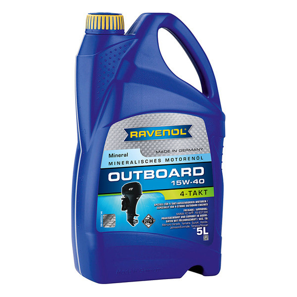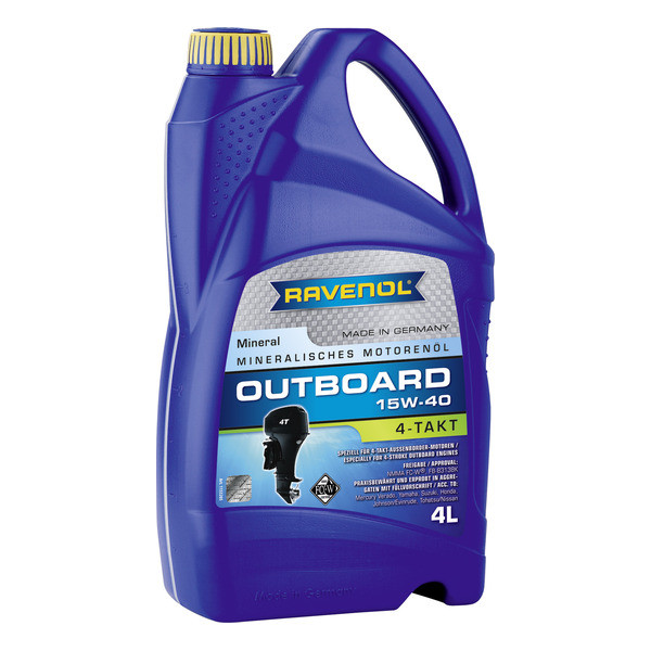 RAVENOL Outboardoel 4T SAE 15W-40 – հանքային շարժիչի յուղ, որը հատուկ նախագծված է 4 հարվածային արտաքին նավակի շարժիչների համար, որոնք ներարկվում են NMMA FC-W-ի պահանջներին համապատասխան: ապահովում է անթերի քսում նույնիսկ բարձր պտույտների և ծանրաբեռնվածության դեպքում, պաշտպանություն մաշվածությունից ՝ ցածրորակ հավելանյութերի փաթեթի շնորհիվ, պաշտպանություն կոռոզիայից: Ներկված է կապույտ գույնով:
