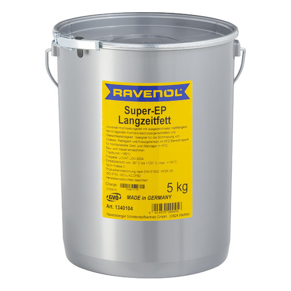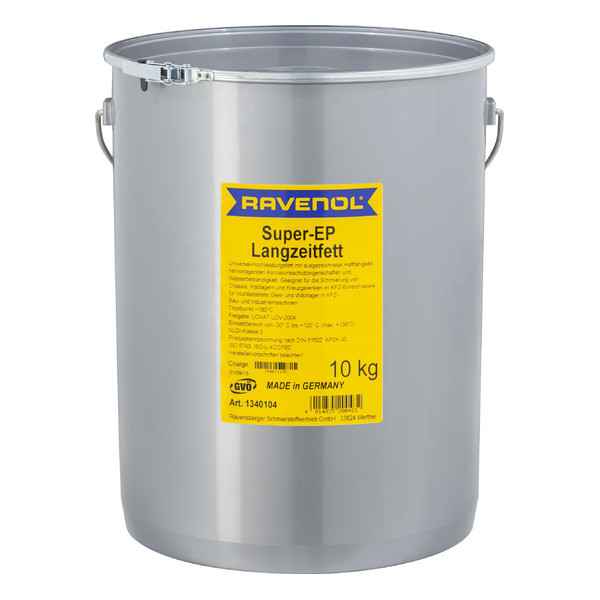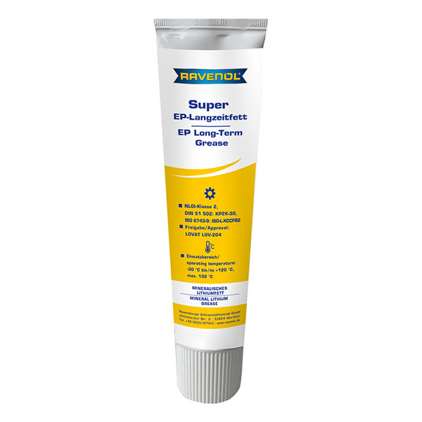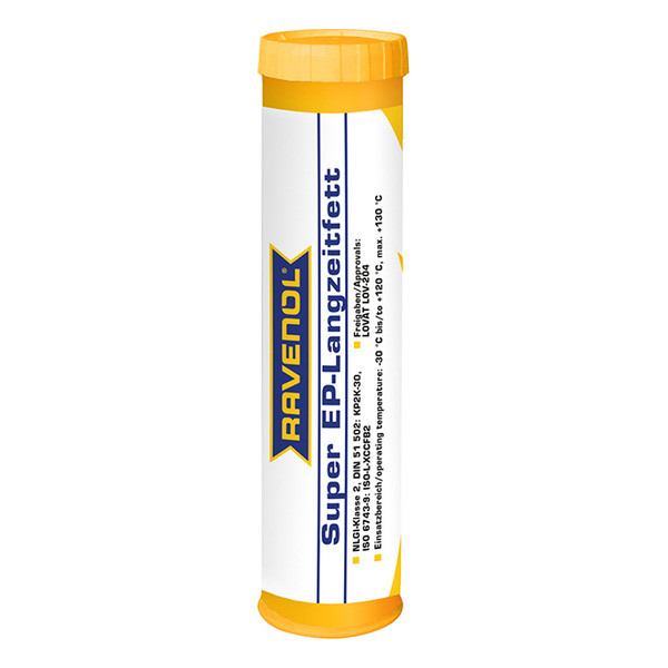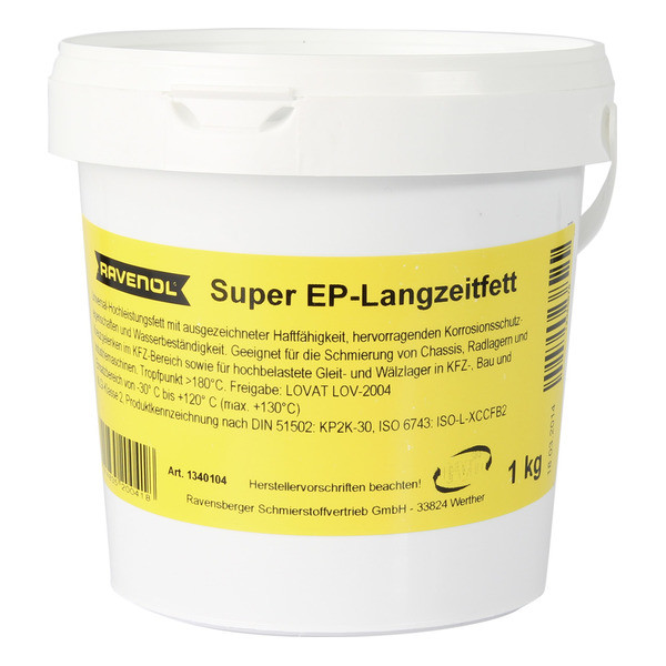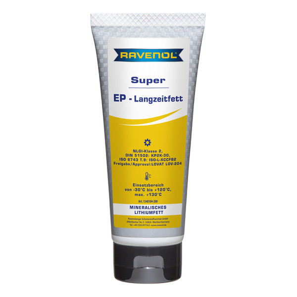 RAVENOL Super EP-Langzeitfett - հանքային հիմքով ավտոմոբիլային քսանյութ, որը խտացված է լիթիումի օճառով ՝ Ավելացված հակաօքսիդիչ և հակակոռոզիոն, հակահամաճարակային հավելանյութերով (EP), ինչը նպաստում է քսայուղերի մասերի ծառայության ժամկետի երկարացմանը և մաշվածության նվազմանը: