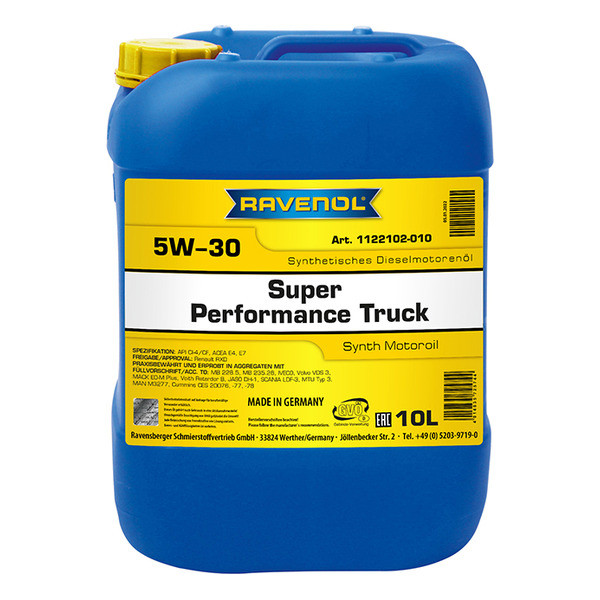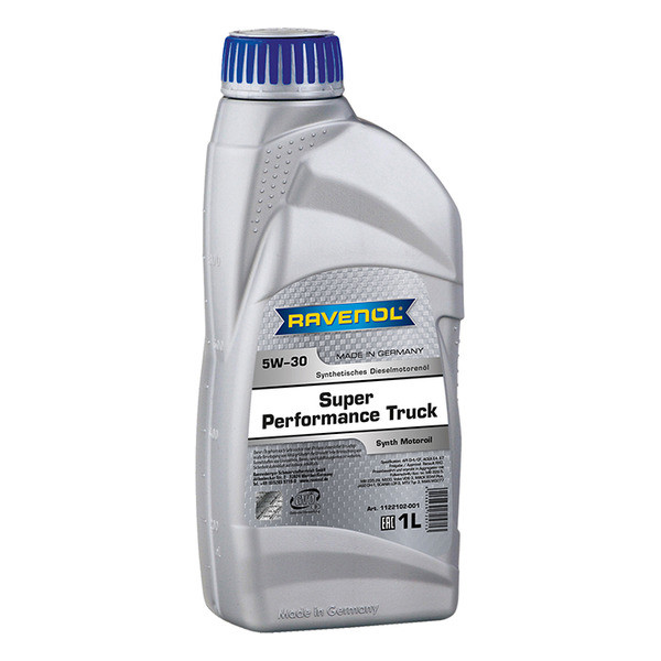 RAVENOL Super Performance Truck SAE 5W-30 – USHPD դասի բարձր լեգիրված թեթև շարժունակ շարժիչային յուղ ՝ հիմնված սինթետիկ բազային յուղերի վրա ՝ հավելանյութերի հատուկ փաթեթով ՝ բեռնատարների, ավտոբուսների, շինարարական տեխնիկայի բարձր բեռնված տուրբոդիզելներում ամբողջ տարվա ընթացքում օգտագործելու համար: