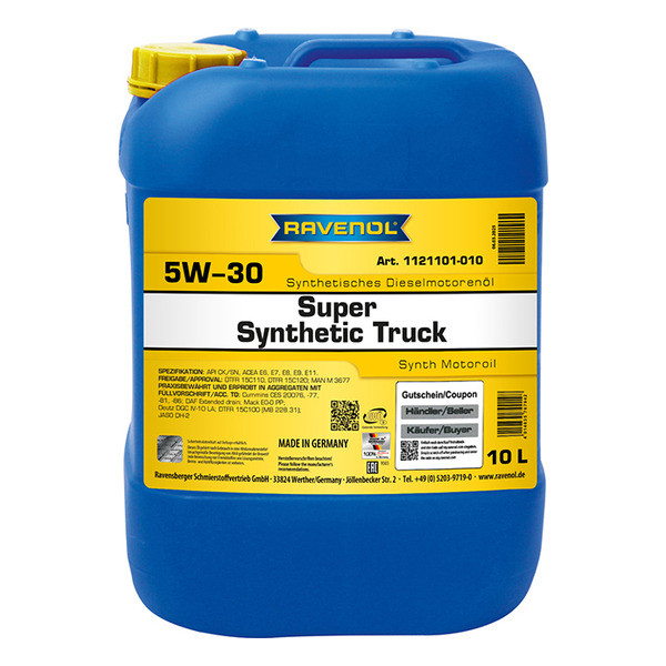 RAVENOL Super Synthetic Truck 5W-30 – սինթետիկ բարձր խառնուրդով, հեշտ հոսող շարժիչային յուղ ցածր մոխրի հավելանյութով փաթեթով (Low SAPS)՝ ամբողջ տարվա ընթացքում EURO 4 և EURO 5 դասի բեռնատարների, ավտոբուսների, շինարարական սարքավորումների բարձր բեռնվածությամբ տուրբոդիզելներում օգտագործման համար՝ արտանետվող գազով և առանց արտանետվող գազով։ զտիչներ և կատալիզատորներ: Եթե մեքենայի արտադրողի կողմից այլ բան նախատեսված չէ, այս յուղի փոխարինման միջակայքը կարող է երկարացվել մինչև 100,000 կմ: