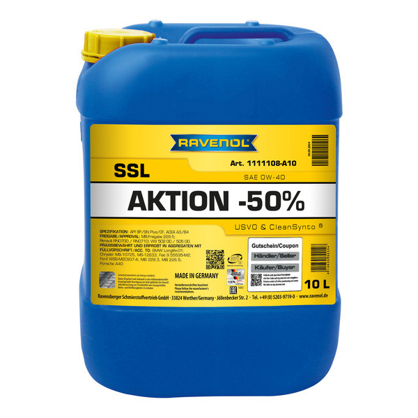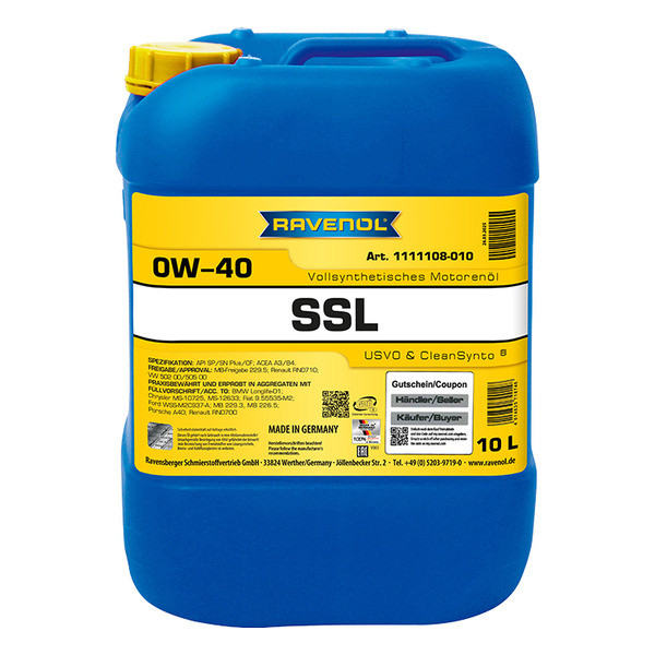 RAVENOL SSL 0W-40 – լիովին սինթետիկ, հեշտ հոսող շարժիչային յուղ, որը մշակվել է CleanSynto® տեխնոլոգիայի միջոցով բենզինային և դիզելային շարժիչների համար՝ տուրբո լիցքավորմամբ և առանց վառելիքի ուղղակի ներարկման մարդատար ավտոմեքենաներում: Ընդլայնված փոխարինման միջակայքերը՝ ըստ տրանսպորտային միջոցների արտադրողների պահանջների: