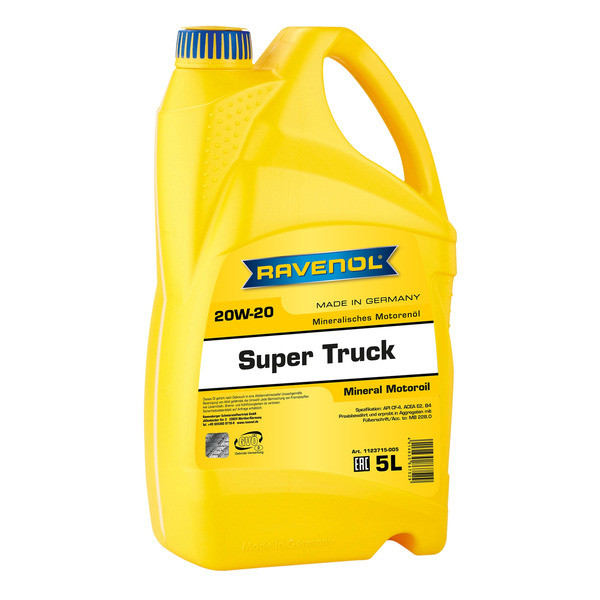 RAVENOL Super Truck SAE 20W-20 բազմաստիճան շարժիչային յուղ է բեռնատարների դիզելային շարժիչներում օգտագործելու համար՝ տուրբո լիցքավորիչով կամ առանց դրա: