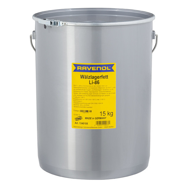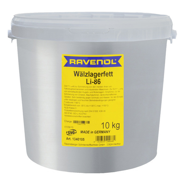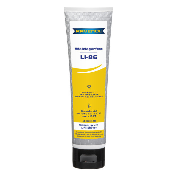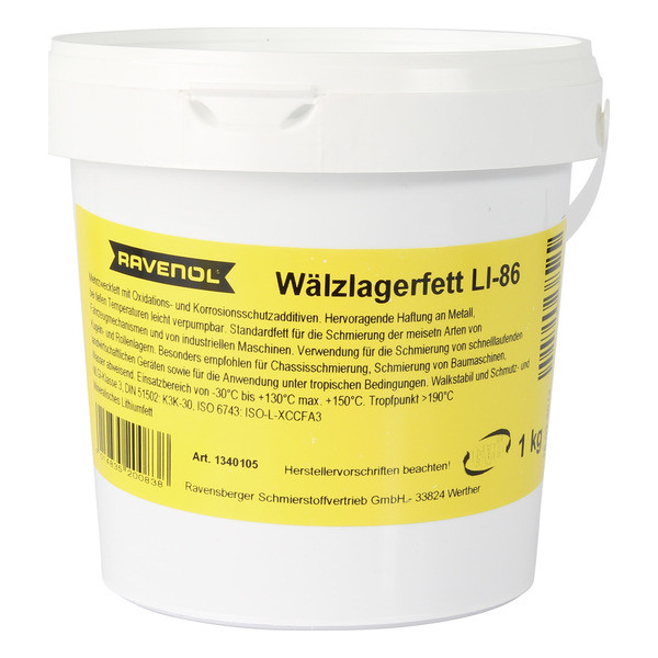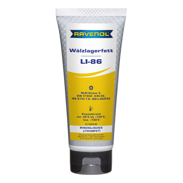 RAVENOL Wälzlagerfett LI 86 – Ունիվերսալ ջրակայուն, հանքային հիմքով պլաստիկ քսանյութ, լիթիումի օճառի օգտագործմամբ, որպես խտացուցիչ, որն ապահովում է պաշտպանություն օքսիդացումից և կոռոզիայից:
